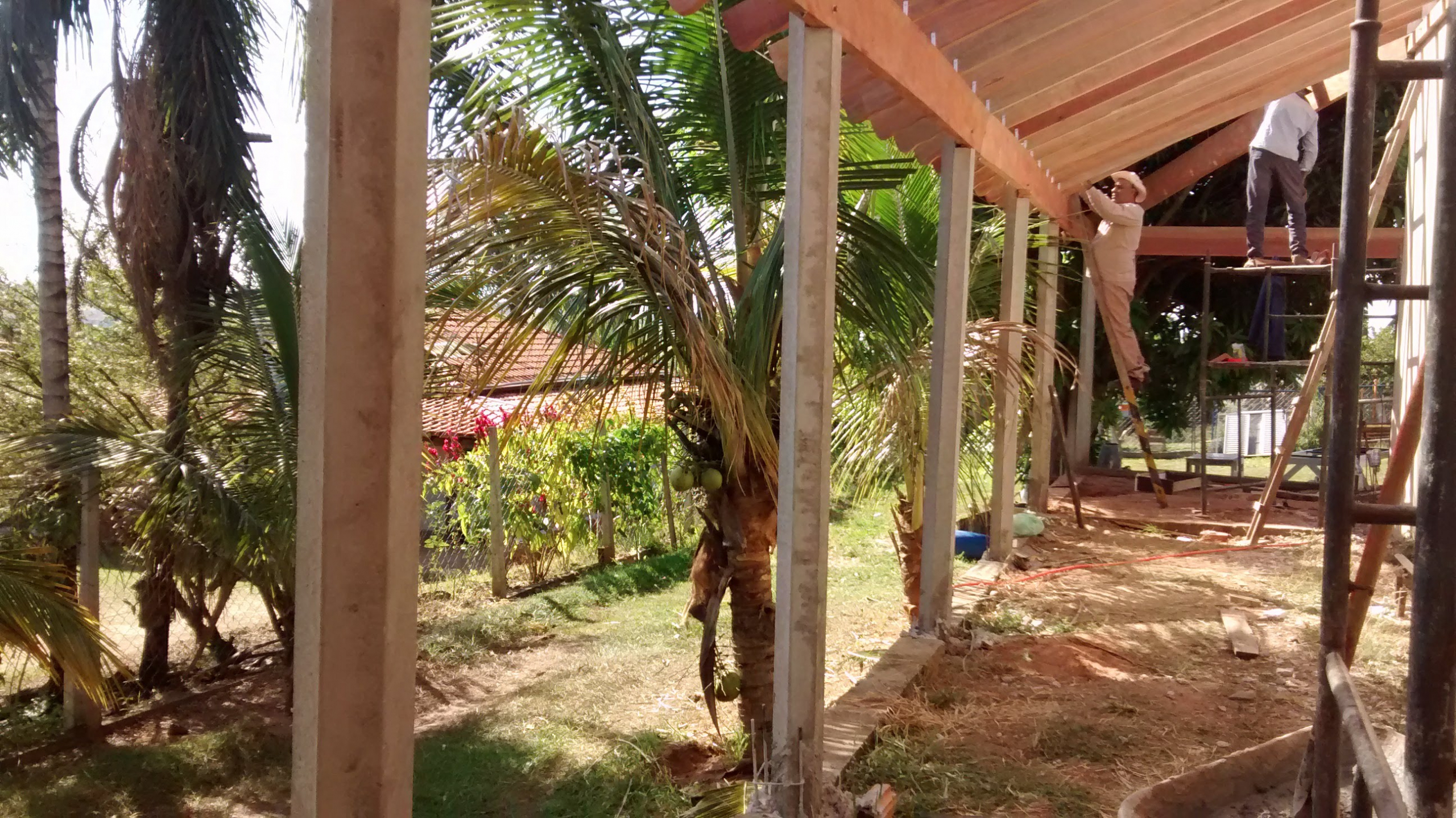 Sendo em primeiro lugar: a construção da varanda em volta de toda a casa junto o espaço da churrasqueira. Do piso em cimento queimado, até cobertura com estrutura em madeira e telha aparente e pintura nas paredes.